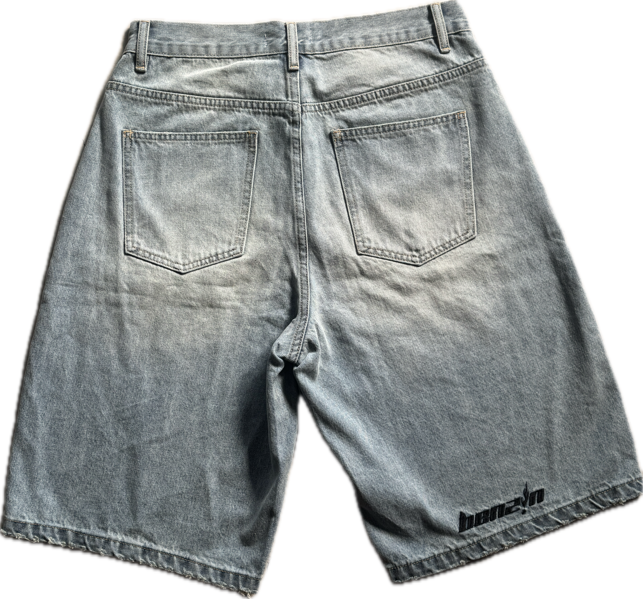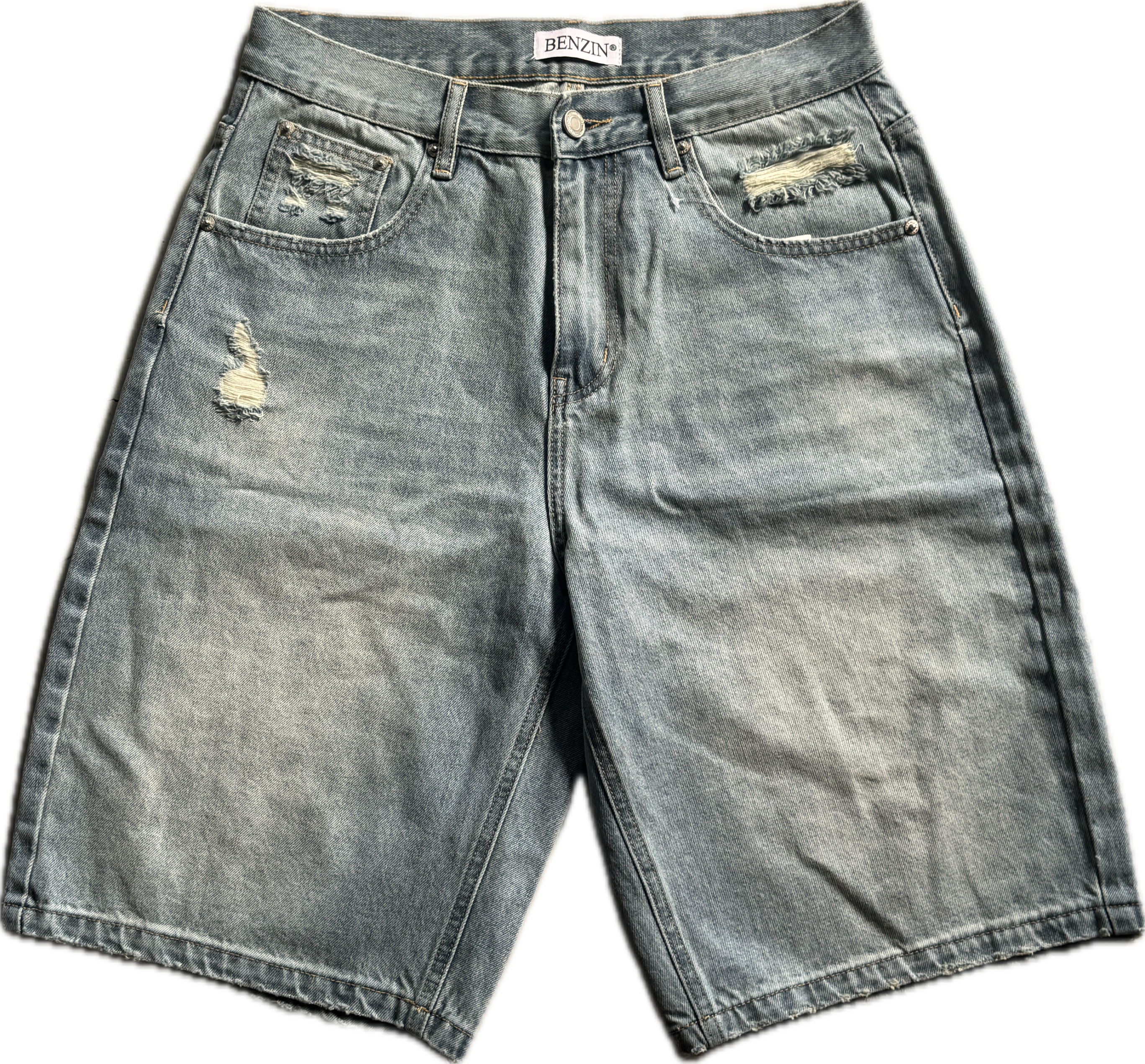BENZINのダメージデニムパンツで、快適さとエッジの効いたデザインで、デニムのクラシックな魅力とモダンなディテールが融合しています。ライトブルーのウォッシュ加工、ダメージ加工のアクセント、そしてバックにあるBENZINのシグネチャが特徴的です。
